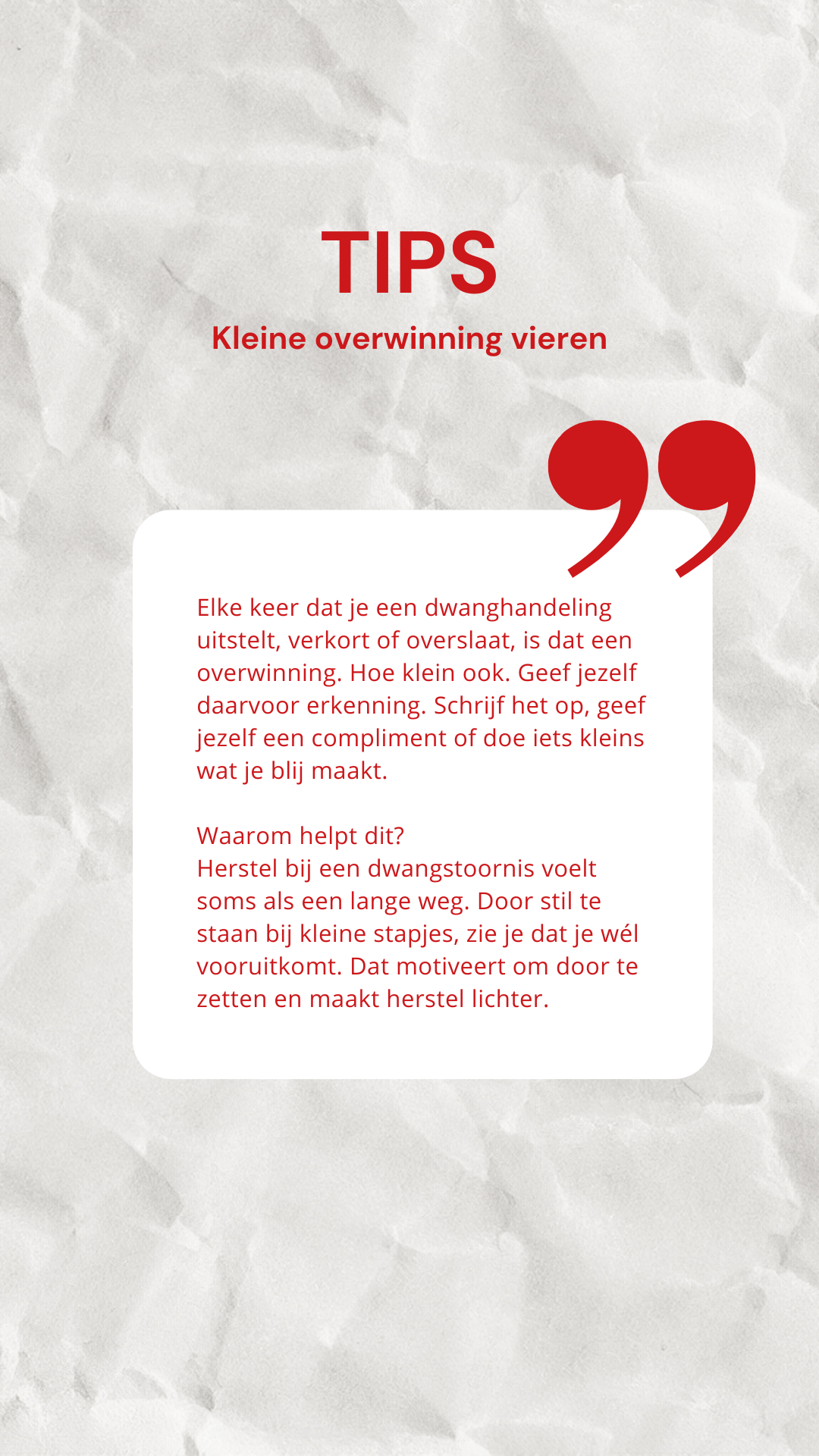 Bij een dwangstoornis kunnen dagelijkse taken of het niet uitvoeren van dwanghandelingen erg zwaar voelen. Het is daarom heel belangrijk om kleine overwinningen te vieren. Iedere keer dat je een dwanghandeling even uitstelt, een angstige gedachte herkent zonder direct te handelen, of een moeilijke situatie aangaat, zet je een stap vooruit.